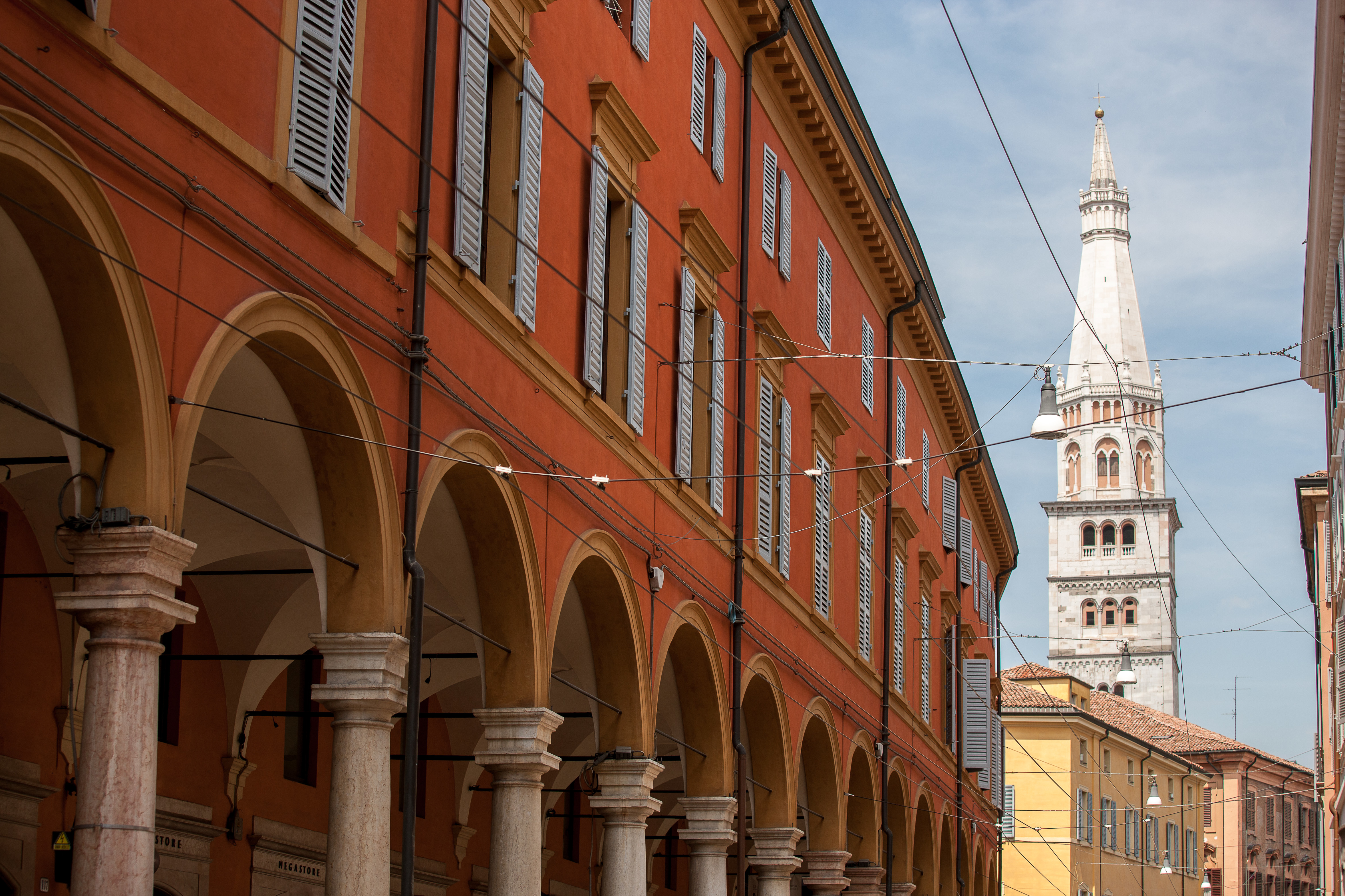 In the center of town, follow Via Emilia to the corner of Corso Canalgrande. Keep Largo di Porta Bologna at your back and look west. Historic Via Emilia seems to point toward the Ghirlandina Tower, framing it in parallel rows of buildings, one of which is a particular stand out: the Baroque-style architecture of the Collegio San Carlo on your left.