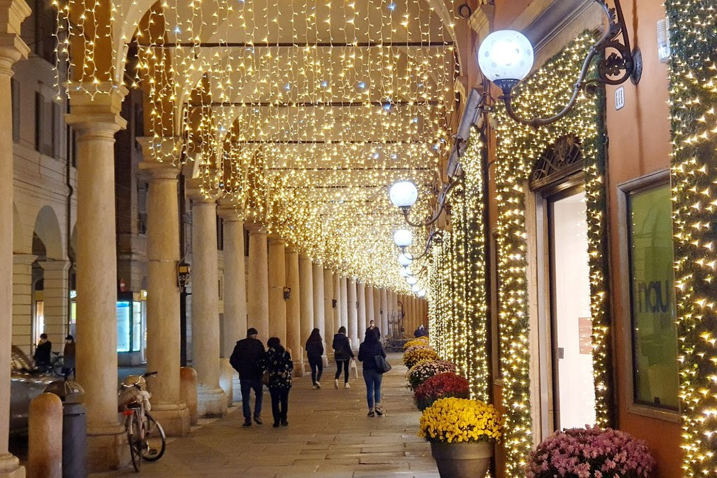 In the same area, cross Via Emilia and step under the splendid Portico del Collegio, your next photographic subject. Walk back to the corner of Via Farini and look south. A beautiful view opens before you: the portico and the shop windows along the street. At Christmas time, the holiday store lights will make your photos twinkle.